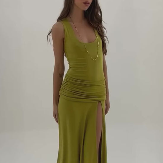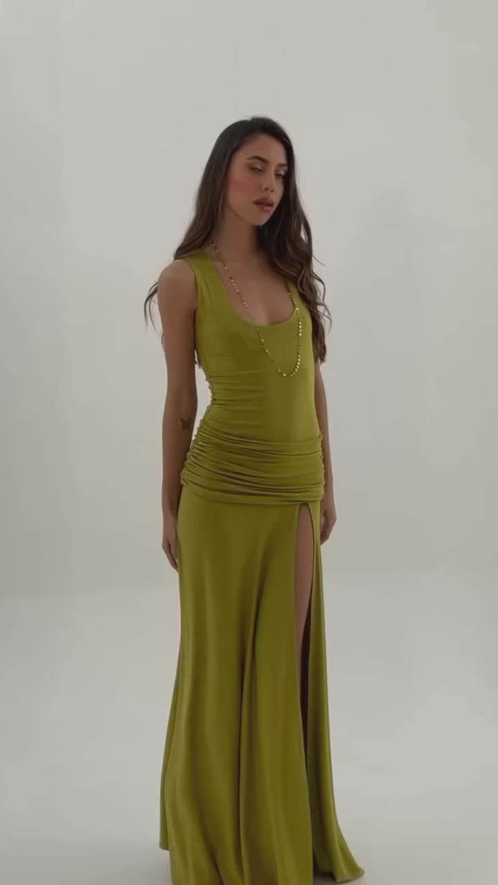 The ruched detail at the waist accentuates the figure, while the side slit adds a touch of subtle sensuality. Available in two vibrant shades: bubblegum pink , full of freshness and femininity, and moss green , sophisticated and perfectly in tune with nature.