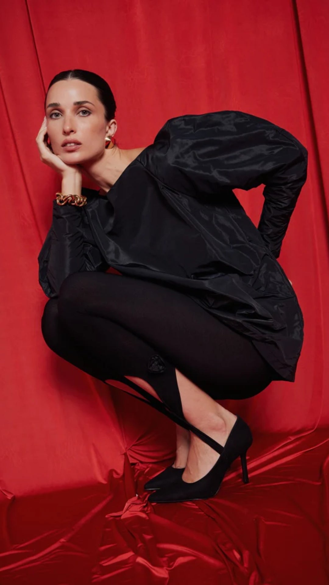 This set includes a top with croissant sleeves and side pockets. The leggings, with stirrups and a delicate floral detail on the leg, complete a comfortable and sophisticated look.