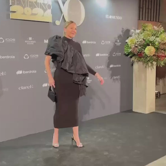 A slim-fit dress with a voluminous side panel inspired by the flames of a blazing fire. Made from silk knit and taffeta. Available in two colors: red and black.