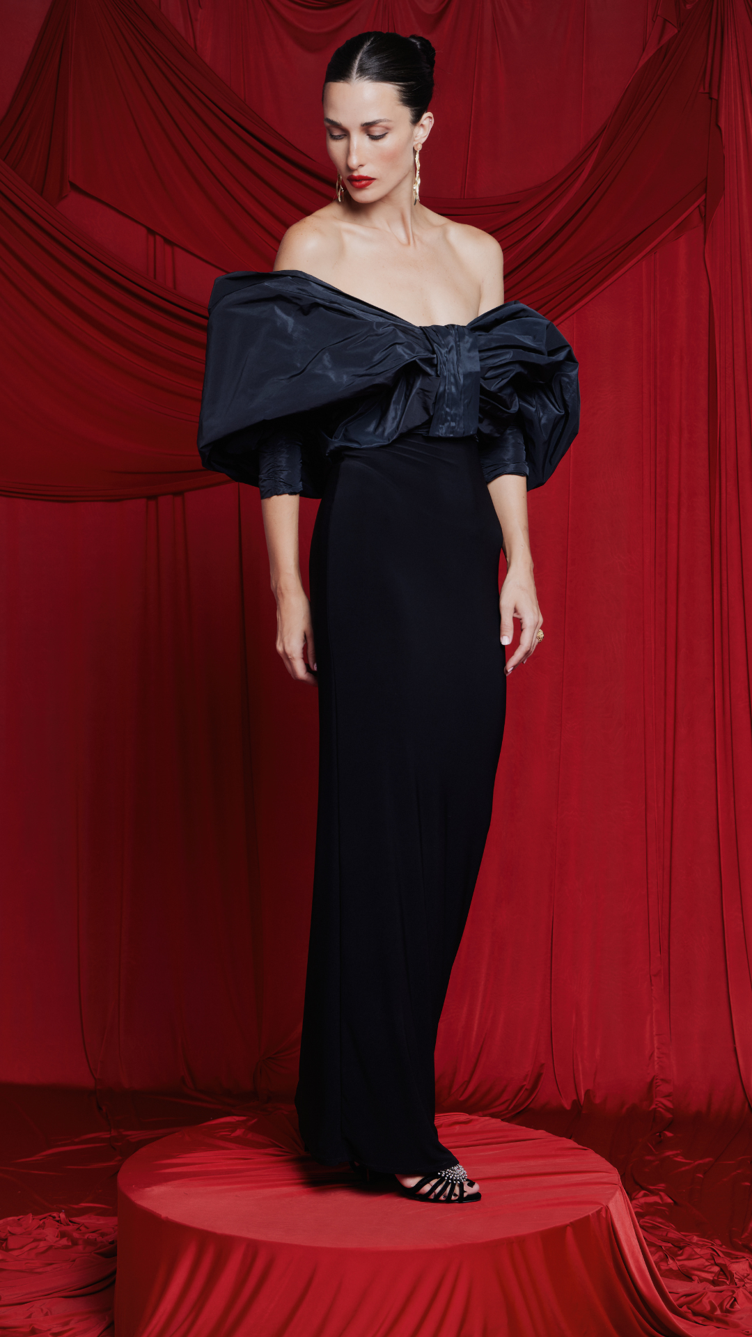 Vestido con diseño efecto lazo en la parte superior. Confeccionado en tafetán, realza la figura con un volumen elegante y una presencia rotunda.