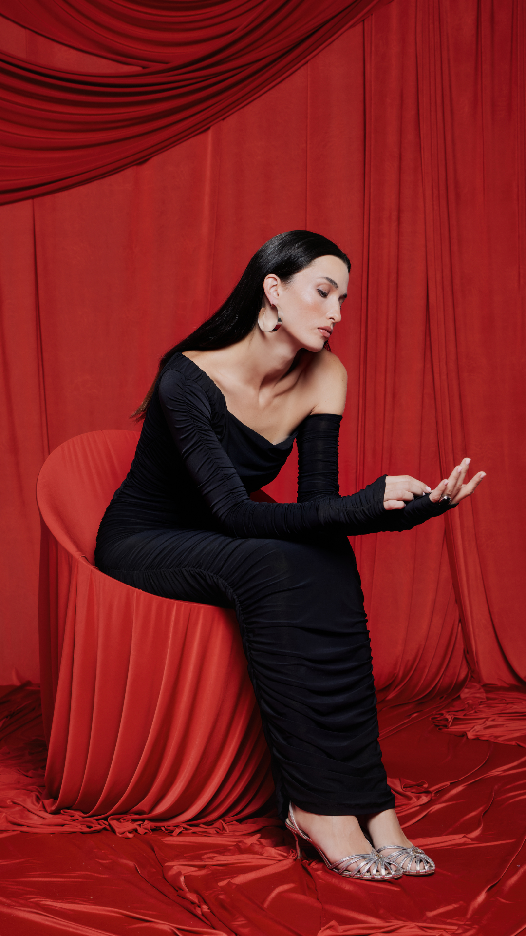 Vestido drapeado confeccionado en punto de seda. Las mangas largas, también drapeadas, completan un diseño elegante y atemporal.