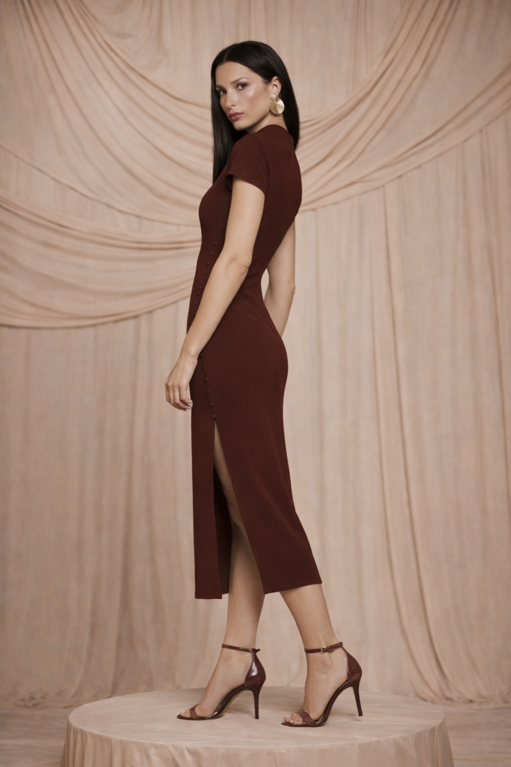 Este diseño declara inspiración china es el vestido perfecto para cualquier evento. La abertura en la espalda y en la falda le otorgan al diseño la originalidad y los botones forrados a lo largo del vestido son el detalle perfecto.