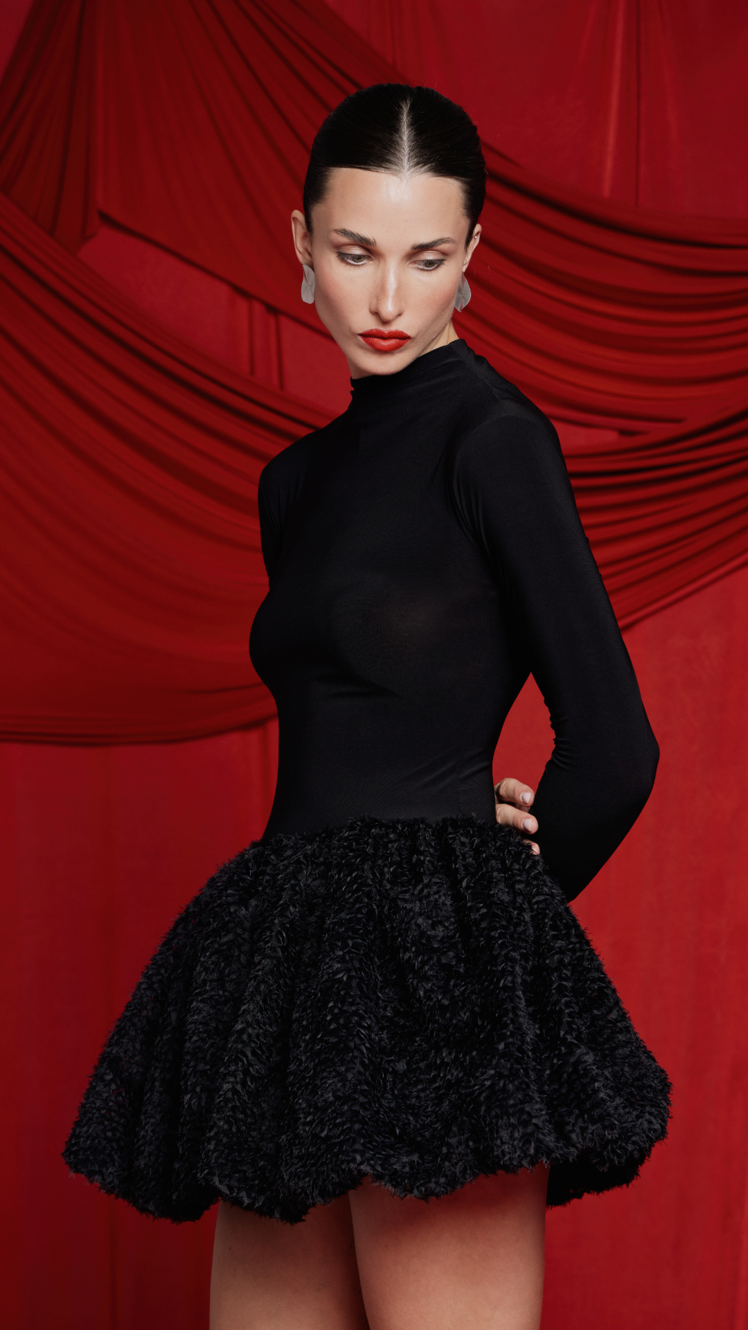 Mini vestido con cuerpo de punto y falda con volumen. Confeccionado en un tul especial de textura ondulada que aporta movimiento y un aire etéreo al diseño.